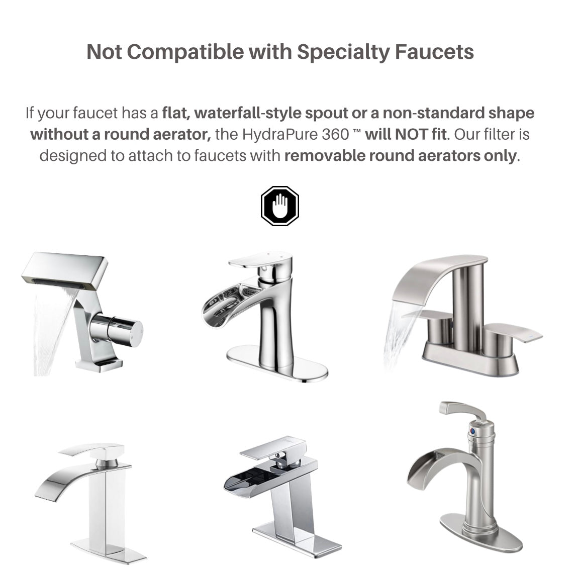 The HydraPure 360™ is designed for most standard faucets, but there are a few styles it will not fit without extensive modification: