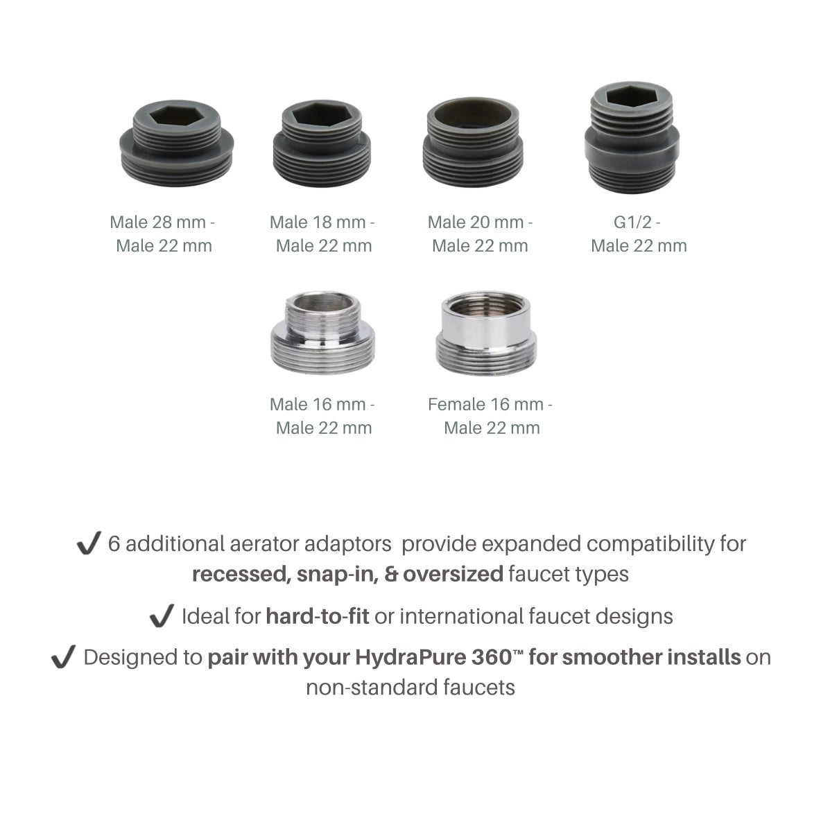 💡 The HydraPure 360™ is already compatible with M22 male aerators (about 21.5–22mm across the threads). No attachment needed — it screws right on! We’ve included the 5 most common adaptors right in the box with your HydraPure 360™, plus rare sizes in our Uncommon Fit Kit™. For most faucets, that’s all you’ll need — but if your faucet is a unique size, it’s just as easy to find the right adaptor.