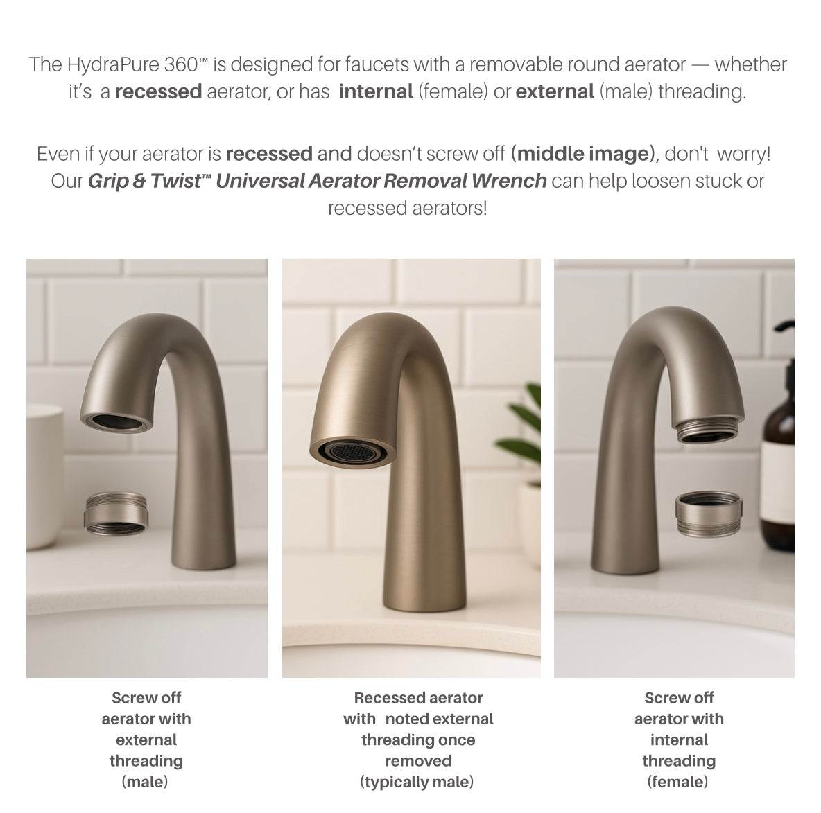 The HydraPure 360™ is designed for faucets with a removable round aerator — whether it’s: